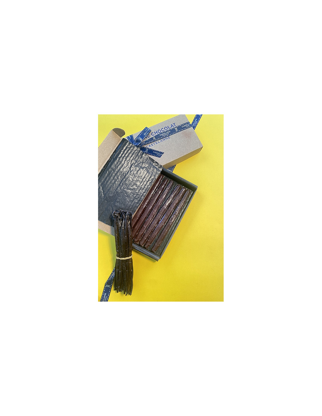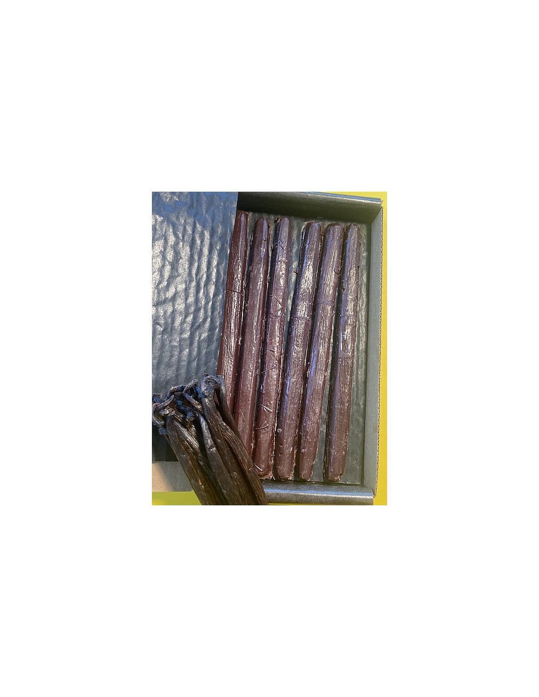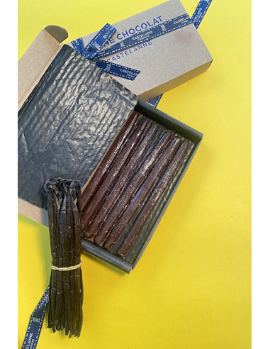 un coffret de 6 gousses de Vanille de Bretagne (forme déposée) composé d'un coulis de vanille concentré et d'une ganache douce de vanille